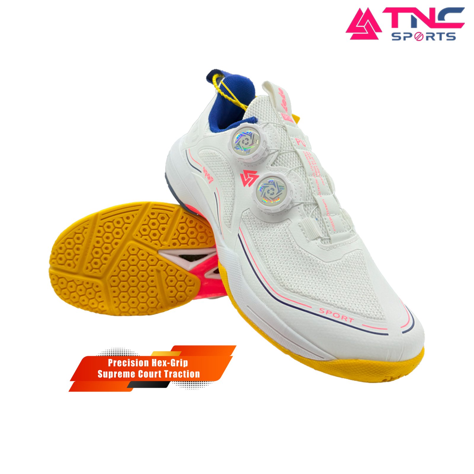 - – Precision Grip Pattern – Yellow hex-grip sole enhances balance and quick footwork across court surfaces.