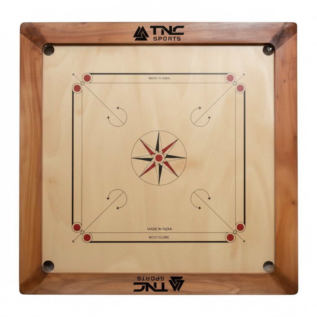 TNC SPORTS Carrom Board Club Natural features a natural-colored frame made from Assam plywood with a sturdy Kikar hardwood border. Its matte finish polish provides water resistance and scratch protection, ideal for long-lasting play.